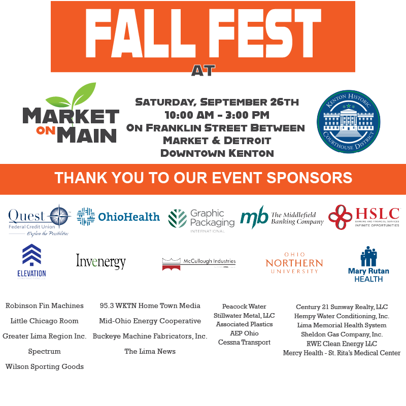 Plan to come out to celebrate the closing of the 2026 Market on Main season and enjoy all the fun of Fall Fest - featuring all your favorite vendors, delicious food trucks, fun kids activities, and so much more! The Market is moving for Fall Fest! You can find us on Franklin Street, between Market and Detroit. Detroit Street, Kenton. Located on Franklin Street, between Market and Detroit Street.