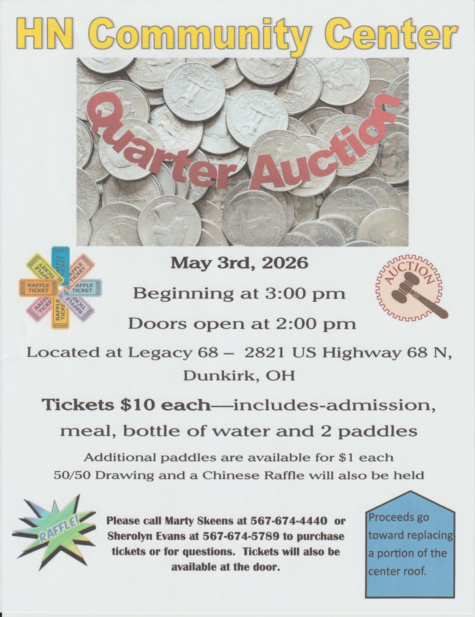 Quarter Auction HN Community Center is having a quarter auction on May 3rd, 2026 to be held at Legacy 68 located at 2821 US Highway 68 N, Dunkirk. Tickets are $10 each that includes the price of admission, a meal, a bottle of water and 2 paddles. Additional paddles are available for $1 each. The event begins at 3 pm with the doors opening at 2 pm. A Chinese raffle and a 50/50 drawing will also be held. Proceeds go toward replacing a portion of the roof. Please call Marty Skeens at 567-674-4440 or Sherolyn Evans at 567-674-5789 to purchase tickets or for questions. Tickets will be available at the door.Quarter Auction | Hardin Northern Community Center